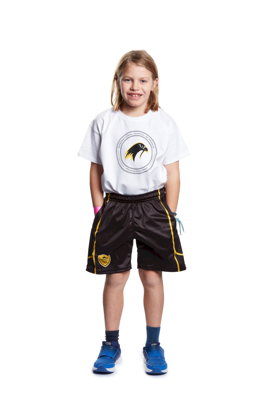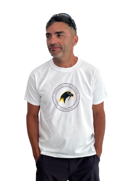 White T-shirt with the Falcon Logo. Intended for Grades 6 to 10 PE Classes and/or for everyday use; different sizes, unisex fit. Brand: Fruit of the Loom.