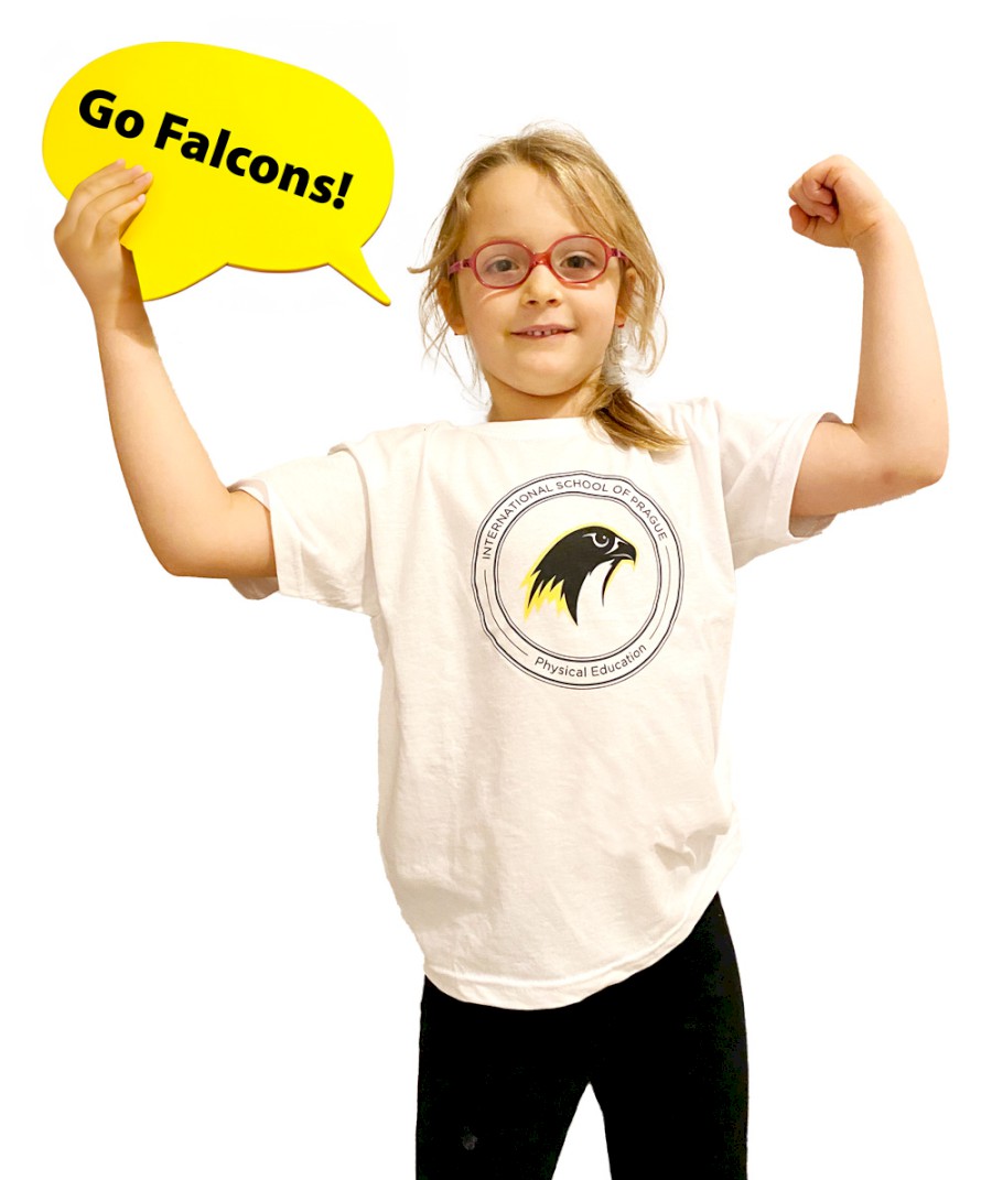 White T-shirt with the yellow Falcon Logo. For everyday use, suitable for PE. Different sizes, unisex fit. Brand: Fruit of the Loom.